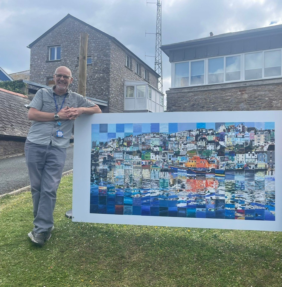 The result is an incredibly imaginative, colourful and stunning collage, which now resides proudly outside the RNLI King’s Quay building, Brixham. Our own Mr Smedley seen here, giving a sense of scale of the piece!