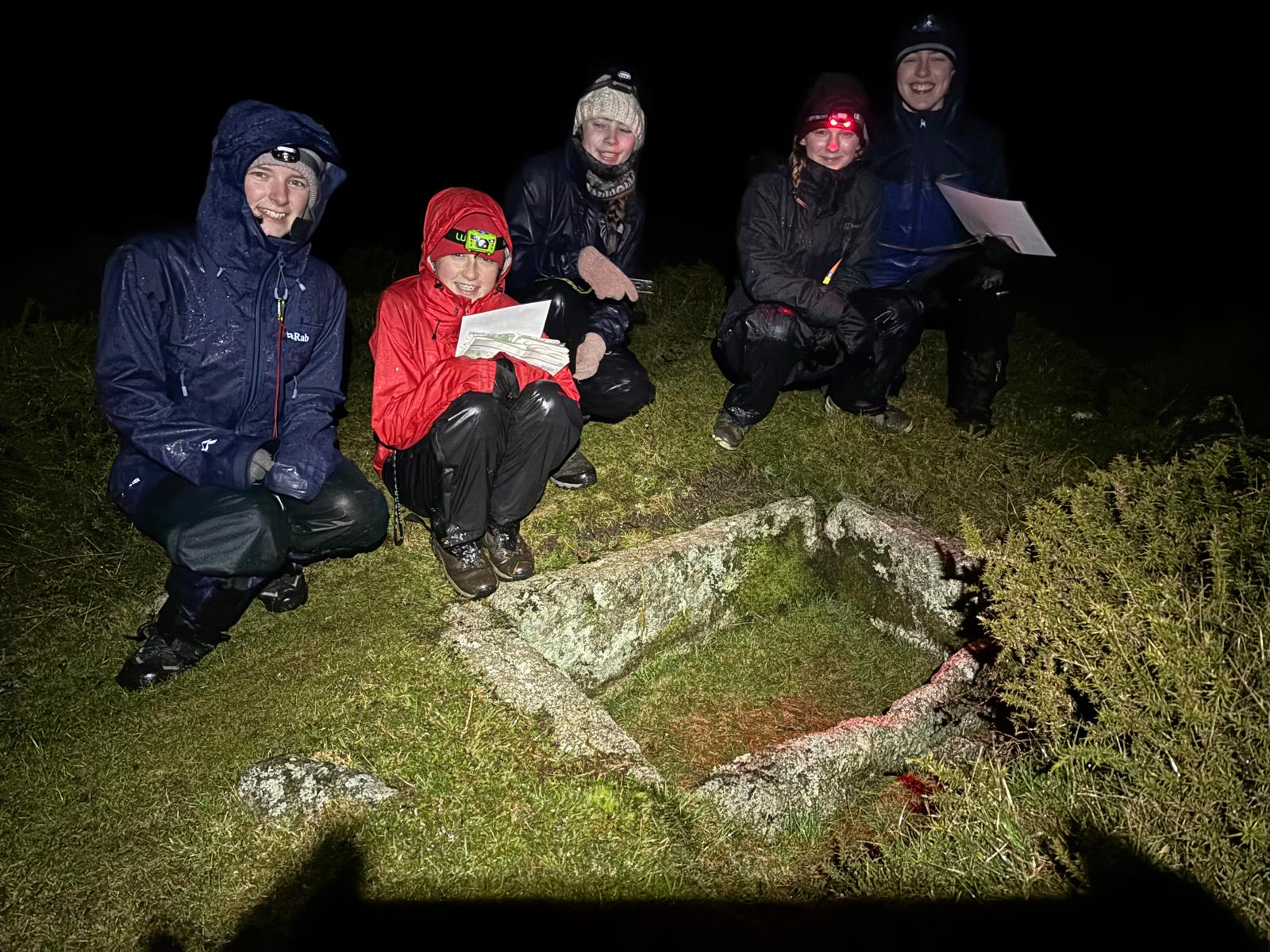 Students went straight from school Friday night, pitched their tents in a bog near Rippon Tor, then undertook some night navigation in the hail. Not to be deterred, they pressed on and were successful in their mission to find the kist (box-like stone burial tomb from the Late Neolithic and Early Bronze Age). Here's one team (still smiling) before the spooky red light was turned on!