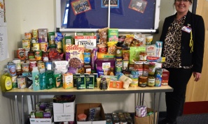 Here's Ms Bucklar very proudly showing off the Harvest Festival donations, very generously donated by our students.